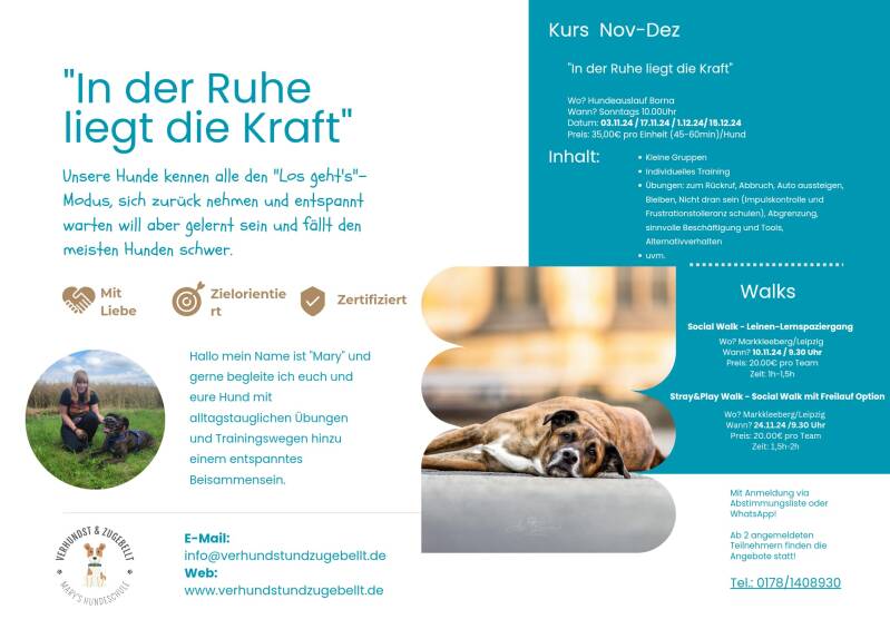 Alle Anfragen zur Hundeschule werden nur von Mary persönlich beantwortet, bitte kontaktiert Mary direkt!
